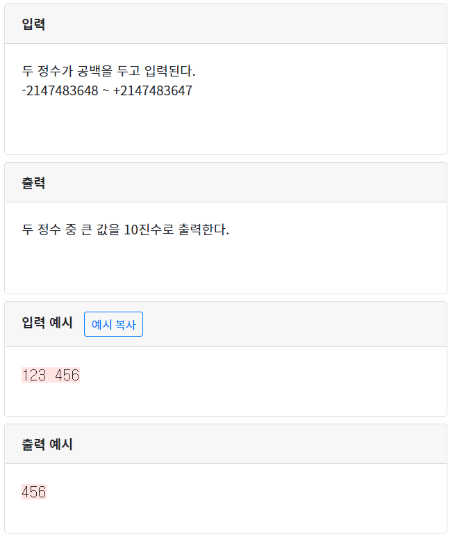 입력된 두 정수 a, b 중 큰 값을 출력하는 프로그램을 작성해보자.