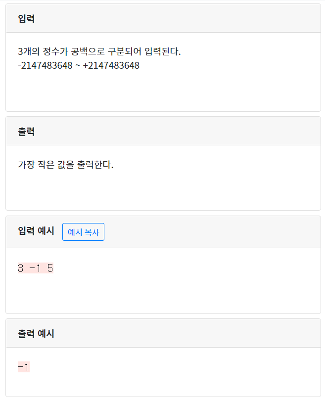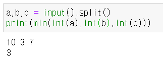입력된 세 정수 a, b, c 중 가장 작은 값을 출력하는 프로그램을 작성해보자.