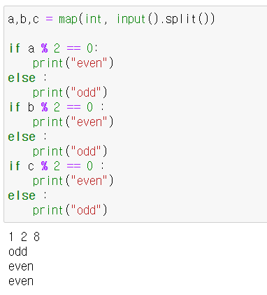세 정수 a, b, c가 입력되었을 때, 짝(even)/홀(odd)을 출력해보자.