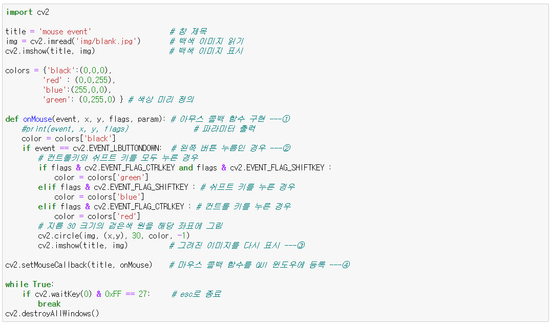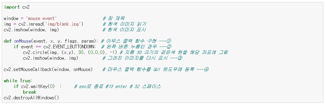 - MouseCallback(event, x, y, flags, param) : 콜백 함수 선언부