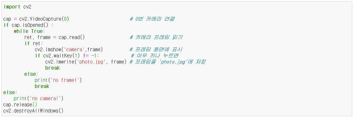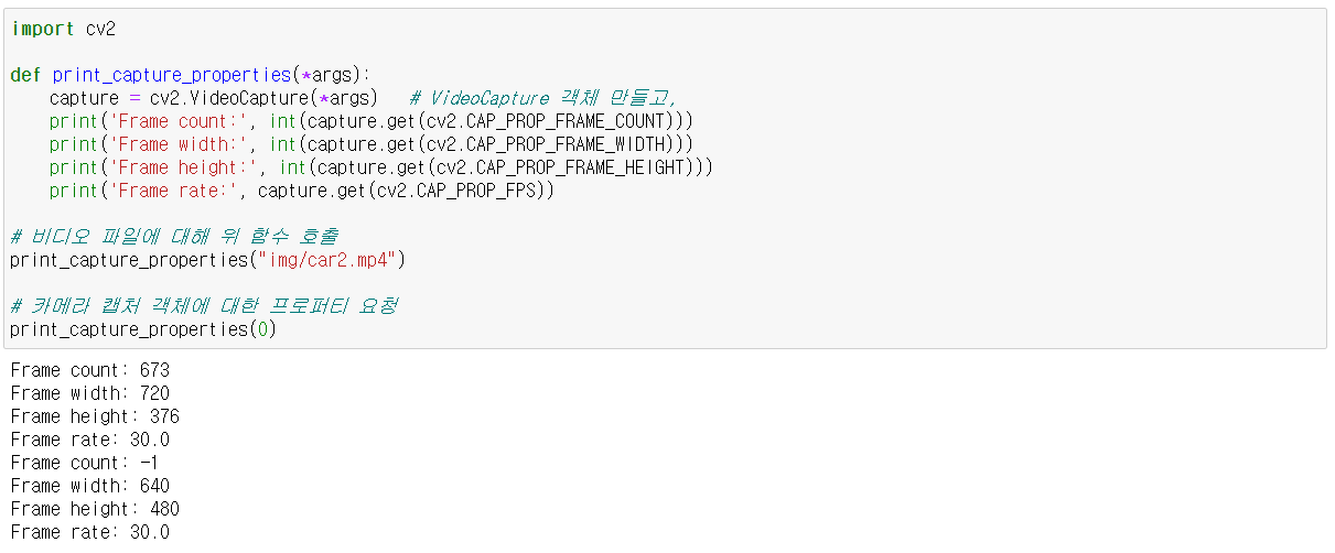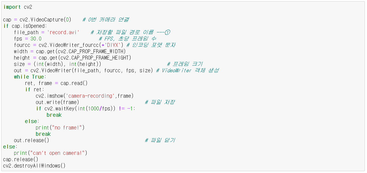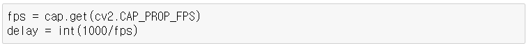 - cap = cv2.VideoCaputure(file_path 또는 index) : 비디오 갭처 객체 생성