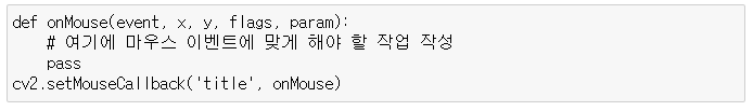 - cv2.setMouseCallback(win_name, onMouse [, param]) : win_name에 onMouse 함수를 등록