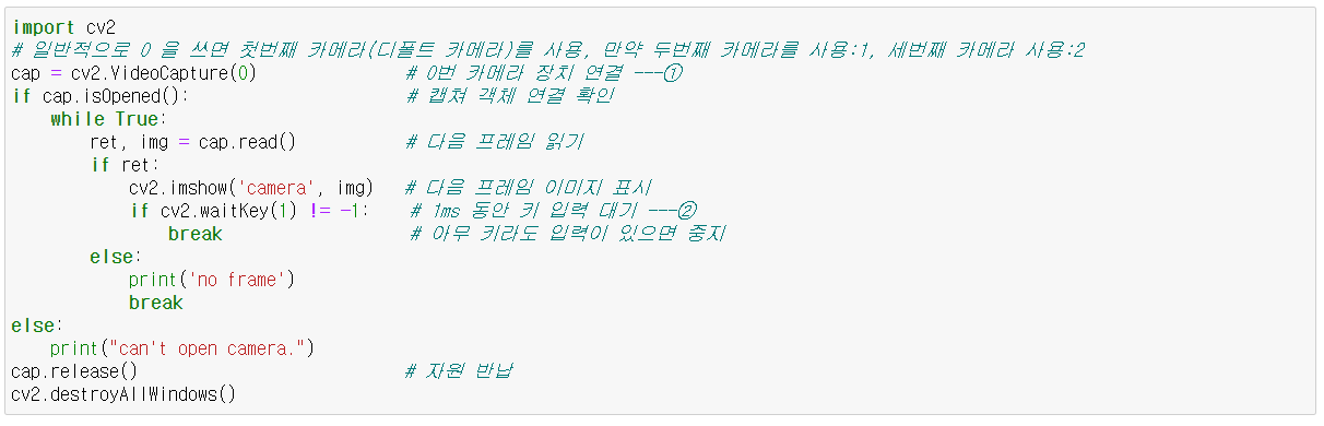 - ret, img = cap.read() : 영상 프레임 읽기