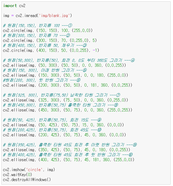 - cv2.ellipse(img, center, axes, angle, from, to, color[, thickness,lineType])