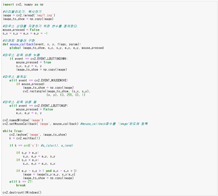 - cv2.EVENT_LBUTTONDUP : 왼쪽 버튼 뗌
