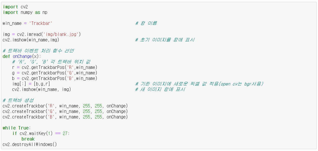 - onChange : TrackbarCallbak, 트랙바 이벤트 핸들러 함수