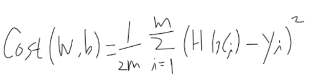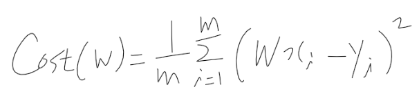 기울기의 최소 값을 구하기 위해서 cost함수를 미분해야 하는데 현재 cost함수는 제곱근 때문에 미분하면 2가 나오기 때문에 복잡해진다. 따라서 식을 다음과 같이 변경한다.