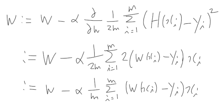 다시 W에 대입해서 미분해보면 다음과 같다. ( ==> 미분하는 이유 : 최소값 구하려고)