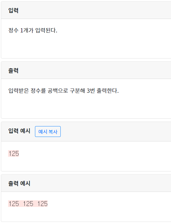 int형 정수 1개를 입력받아 공백을 사이에 두고 3번 출력해보자.