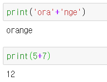 - 플러스(+)를 쓰면, 문자끼리는 공백없이 이어져서 출력이 되고, 숫자끼리는 합산된다.