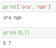- 콤마(,)로 구분하면, 문자, 숫자 상관없이 일정공백을 사이에 두고 출력