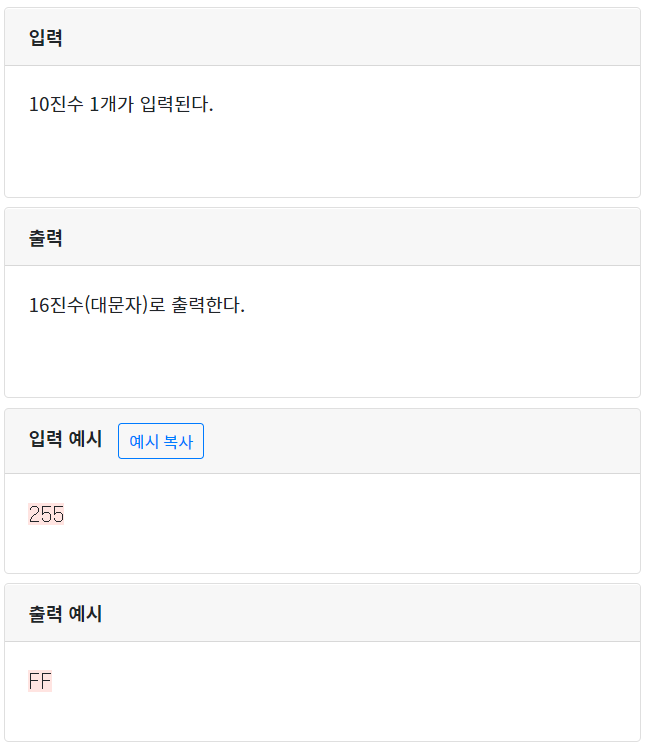10진수를 입력받아 16진수(hexadecimal)로 출력해보자.