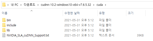 아래 CUDA 설치했던 폴더 내에 위 파일들을 복붙하여 bin, include, lib 폴더를 덮어씌우기.