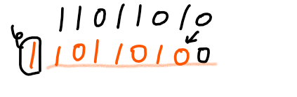 (가장 왼쪽에 있는 1은 8비트 범위를 벗어나므로 사라지게 되고, 가장 오른쪽은 0이 새로 추가된다.)