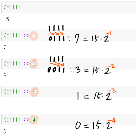 - 변수의 값을 오른쪽으로 지정된 비트 수 만큼 이동 - 오른쪽으로 1비트 밀때마다 1/2씩 줄어든다. - 2로 나눈 것과 같은 효과 - n >> m : n / 2의 m승 |