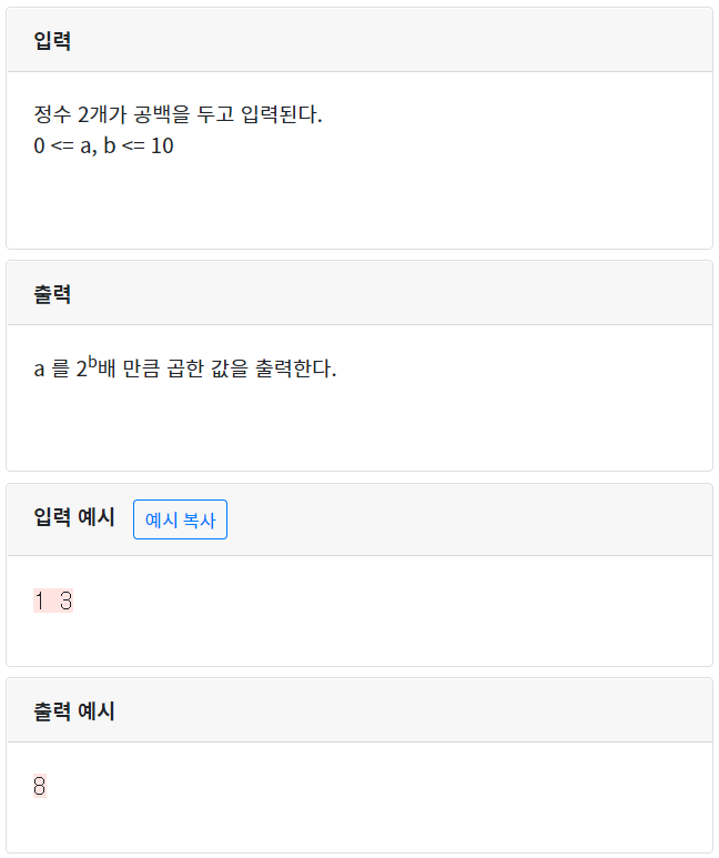 정수 2개(a, b)를 입력받아 a를 2^b배 곱한 값으로 출력해보자.