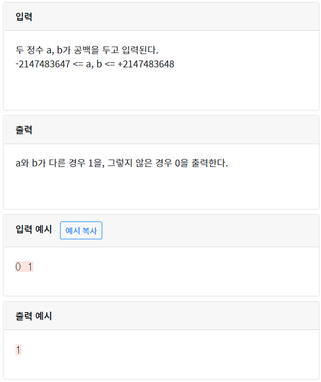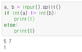 a와 b가 서로 다르면 1을, 그렇지 않으면 0을 출력하는 프로그램을 작성해보자.