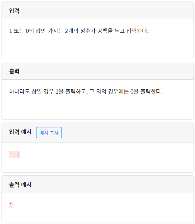 두 개의 참(1) 또는 거짓(0)이 입력될 때,