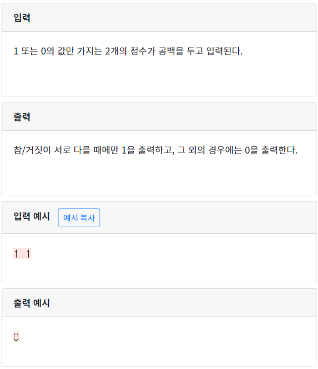 [CodeUp]기초100제(python)_1056번 : [논리연산] 참/거짓이 서로 다를 때에만 참 출력하기(XOR 연산) 본문