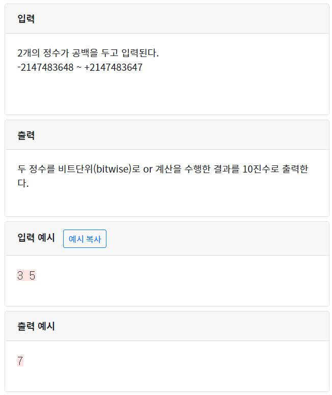 입력된 정수 두 개를 비트단위로 or 연산한 후 그 결과를 정수로 출력해보자.