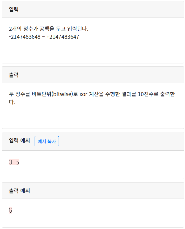 입력된 정수 두 개를 비트단위로 xor 연산한 후 그 결과를 정수로 출력해보자.