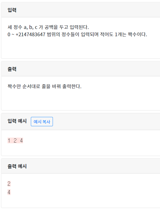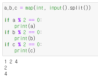세 정수 a, b, c가 입력되었을 때, 짝수만 출력해보자.