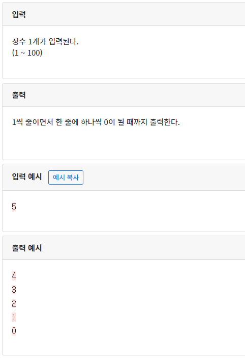 [CodeUp]기초100제(python)_1075번 : [조건/반복실행구조] 정수 1개 입력받아 카운트다운 출력하기2 본문