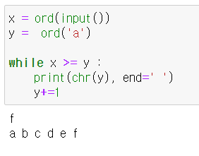 영문자(a ~ z) 1개가 입력되었을 때 그 문자까지의 알파벳을 순서대로 출력해보자.