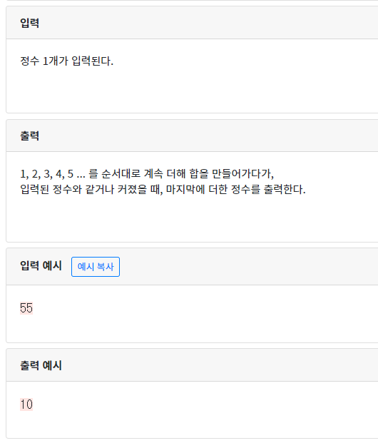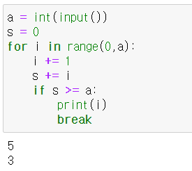 어디까지 더해야 입력한 수보다 같거나 커지는지 알아보고자 하는 문제이다.