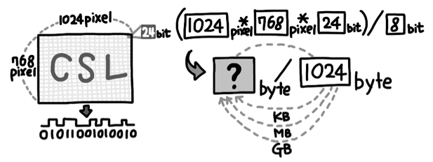 1024 * 768 사이즈에 각 점에 대해 24비트로 저장하면 그 이미지를 저장하기 위한