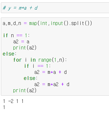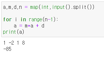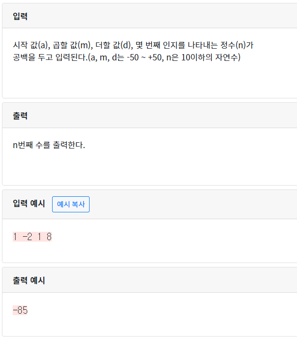 시작 값(a), 곱할 값(m), 더할 값(d), 몇 번째인지를 나타내는 정수(n)가 입력될 때,